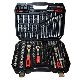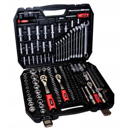 Profesjonalny zestaw narzędziowy 219 elementów to rozbudowany komplet kluczy nasadowych, bitów oraz kluczy płasko-oczkowych przeznaczony do pracy w warsztacie, garażu, jak i przy domowych naprawach. Narzędzia wykonano z wytrzymałej stali chromowo-wanadowej CR-V o satynowym wykończeniu, co gwarantuje odporność na zużycie nawet w trudnych warunkach.
