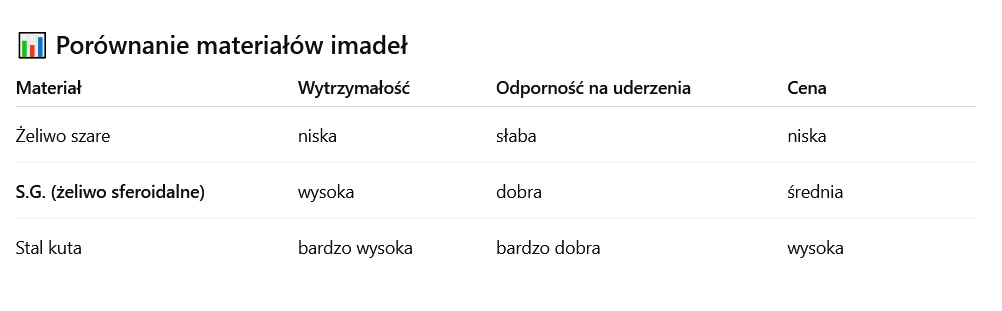 Zastosowanie stali S.G. gwarantuje znacznie większą wytrzymałość niż w przypadku standardowego żeliwa. Materiał ten łączy twardość z elastycznością, co przekłada się na długą żywotność narzędzia nawet przy intensywnym użytkowaniu.